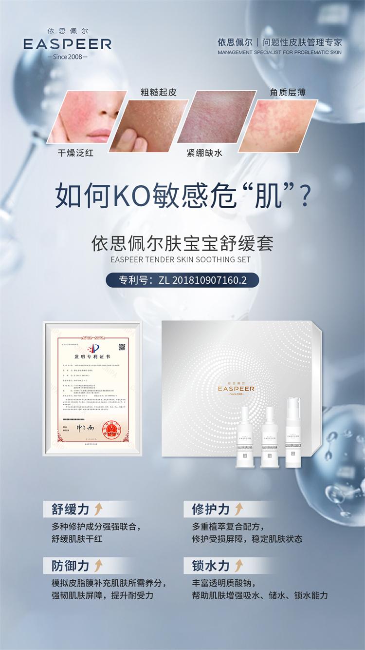 迎合趋势,才能向美而生,本次大会依思佩尔重磅发布的两大技术之一——“敏感肌联合修护术”。依思佩尔研发团队联动多位皮肤领域专家,专研敏感肌修护体系,重磅推出“肤宝宝舒缓套”,以敏感根源修护为核心,专利配方协同复配,强势维稳(专利号ZL201810907160.2)(专利成分:玉竹、甘草根、马齿苋、淡竹叶、半枝莲、合欢树皮、谷精草)利用现代发酵技术,高效提取,协同增效,促进皮肤细胞间脂质的合成,抑制皮肤过度反应,重建皮肤舒适度。同时遵循敏感肌修护三步曲肌肤屏障修护、肌肤调节舒缓、降低过度反应,精准修护,长时维稳,增强吸水、储水、锁水,加速肌肤微循环,强韧肌肤屏障,抵御外界刺激,快速解决干、痒、红、热,让肌肤快速回复健康自然状态。告别敏感肌,就选依思佩尔;专修敏感肌,实例见证效果。