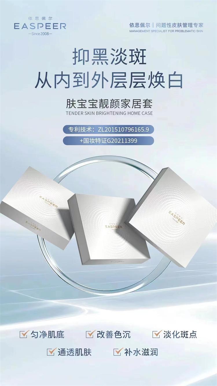 本次大会依思佩尔重磅发布的两大技术之二——“色素色斑管理术”。依思佩尔专家团队攻破美白淡斑技术壁垒,重磅推出“肤宝宝靓颜套”,着眼于美白祛斑关键“降低黑色素生成的连锁反应”,研发独特专利技术,专利配方协同复配,强势美白淡斑(专利证书+专利号ZL201810907160.2)(专利成分:积雪草、光果甘草、黄芩、虎杖、人参、紫球藻、银耳、欧洲落叶松)同时集合各大美白成分于一身,从而达到净化表层沉淀老废黑色素,阻断减弱酪氨酸酶的活性,减少黑色素的合成和释放,延缓其传输力,让黑色素处于“休眠状态”。通过权威美白淡斑测试,祛斑美白特证认证,结合独特仪器——无创无痕祛斑仪,从4大通路,直击色斑色素母体(抑制黑色素前体生成)(温和狙击黑色素传输)(直达肌底击碎黑色素)(加快净化沉积黑色素),