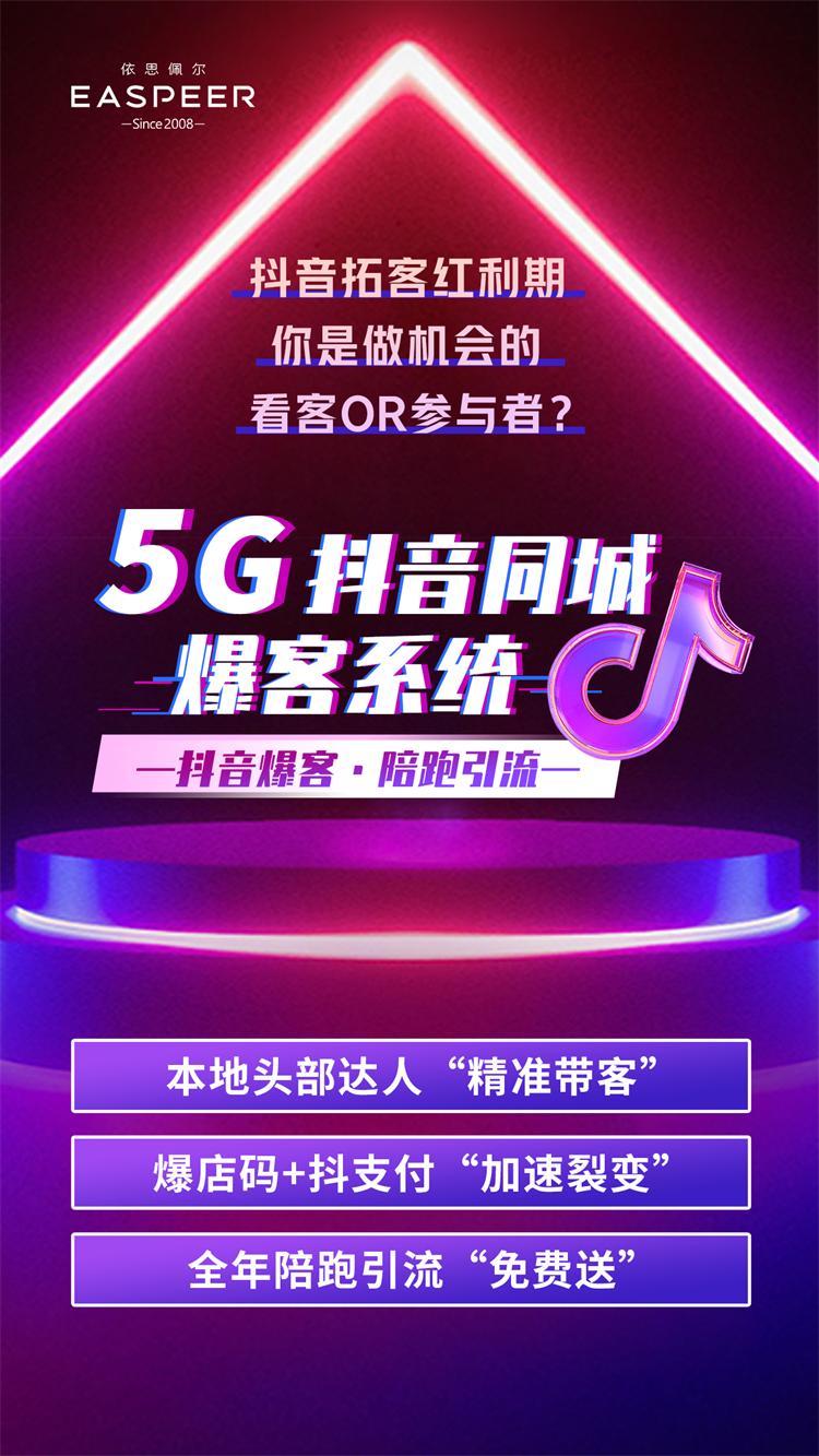大会现场,依思佩尔重磅发布《5G抖音爆客系统》,帮助门店提升客流和赚钱能力,特别是定制的抖支付裂变码、爆客裂变码,好好利用抖音同城的优势资源,总部团队全年免费陪跑教你做抖音,而且只要合作就送方案,包产品、包礼品、包店销,通过抖音把门店知名度打出去,把钱收回来。0经验,0门槛,把客源裂变做好。《5G抖音爆客系统》,抖音过审、团购套餐、蓝V认证、达人资源、抖支付、爆客码、服务一应俱全;本地头部达人为你“精准带客”,让你的顾客成为你的金牌宣传官,覆盖门店范围5公里精准客户,让门店迅速拓新客200个以上!